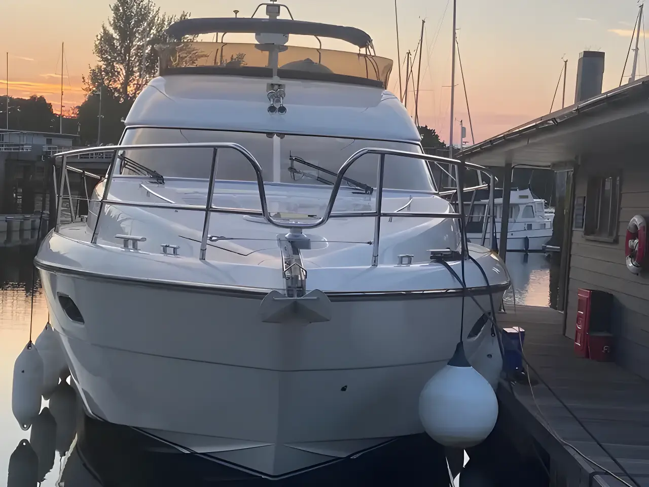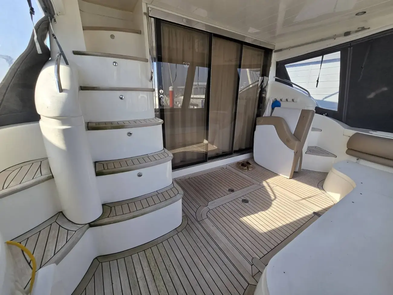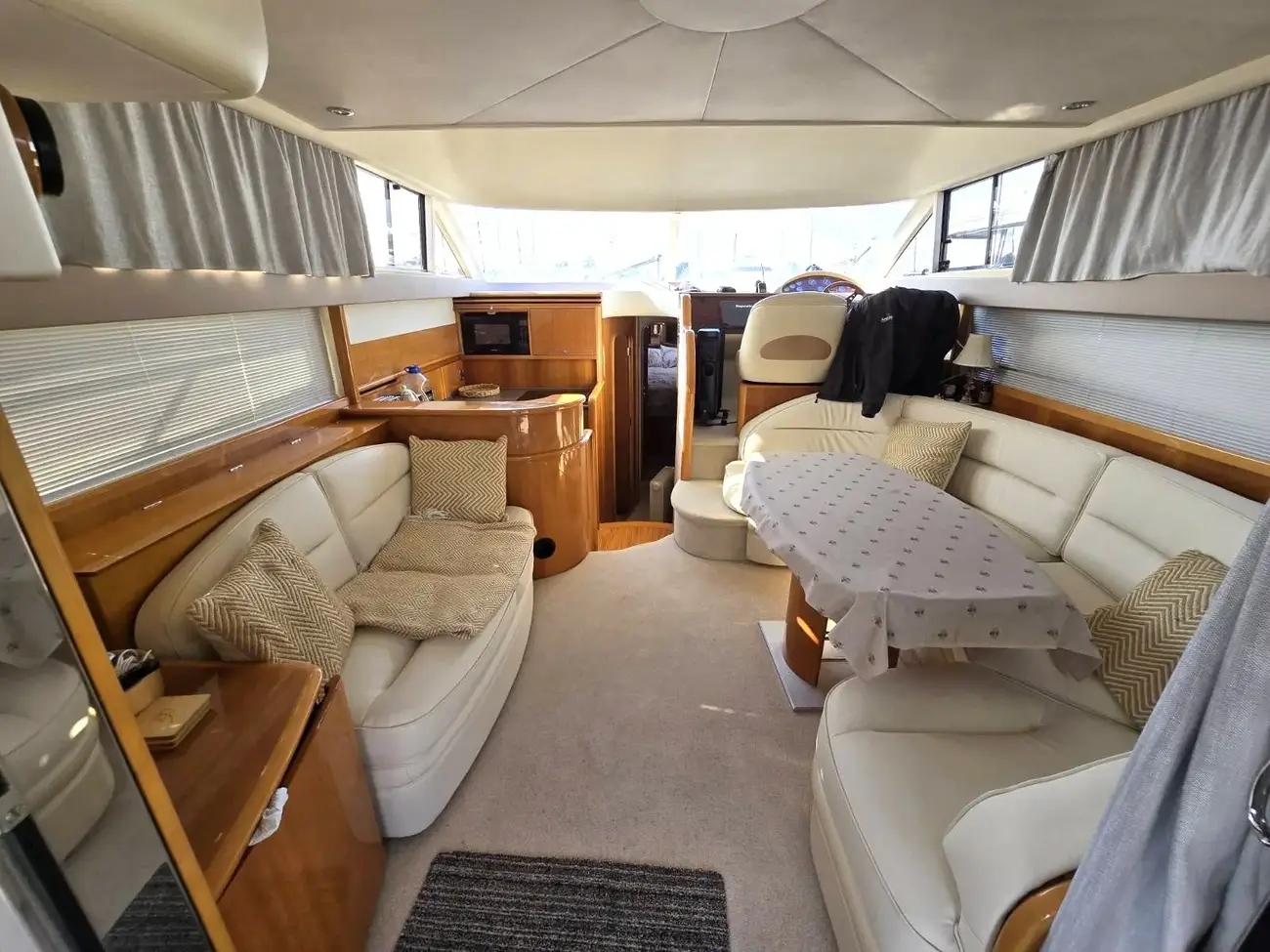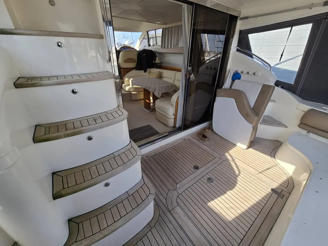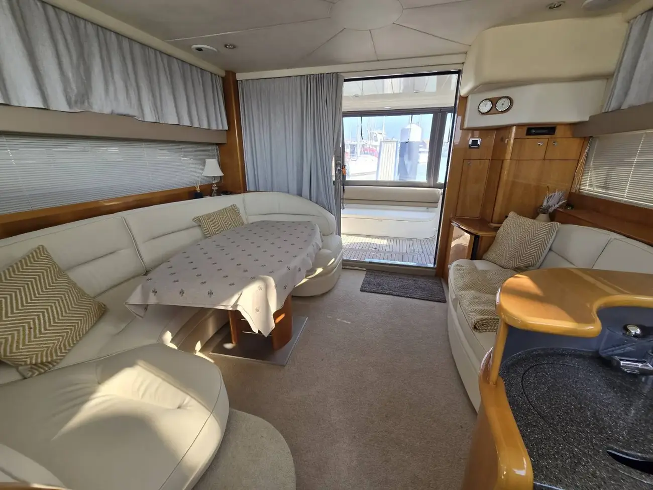 Her well-appointed flybridge provides excellent visibility and a generous social space for entertaining, while the bright saloon below features comfortable seating, refined wood finishes, and panoramic windows that flood the interior with natural light. The thoughtfully arranged galley and dining area create a welcoming onboard living environment.