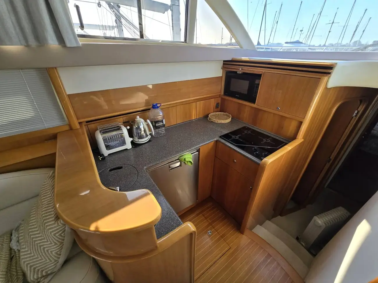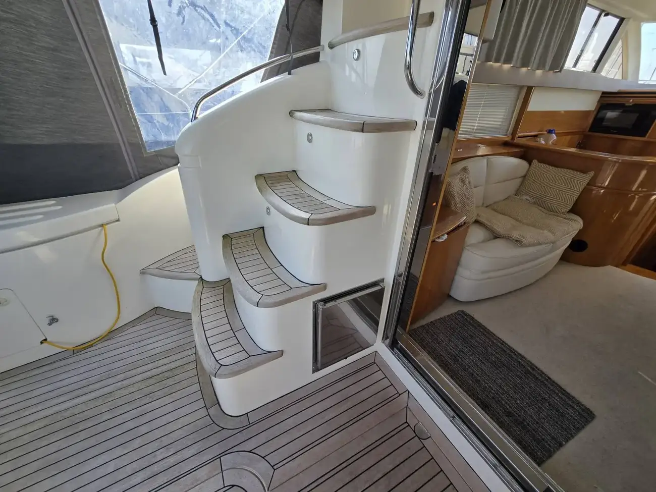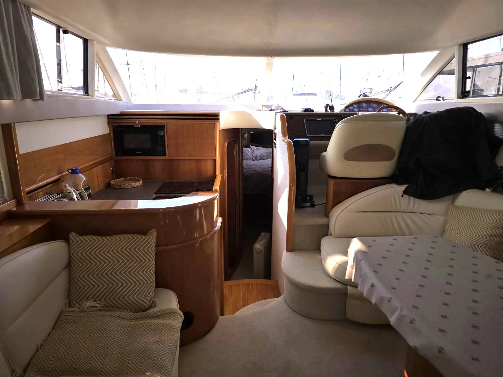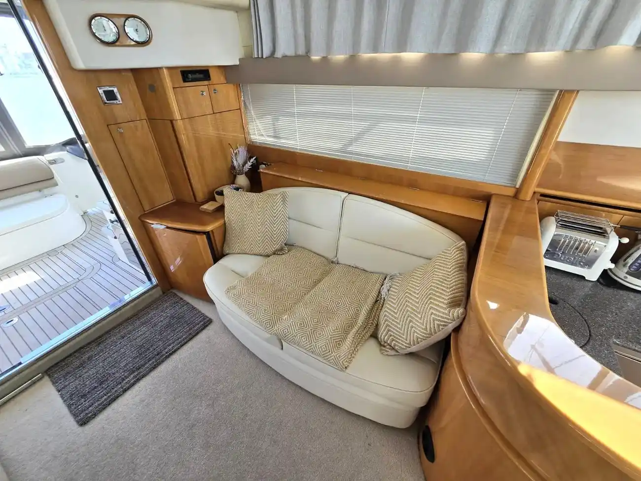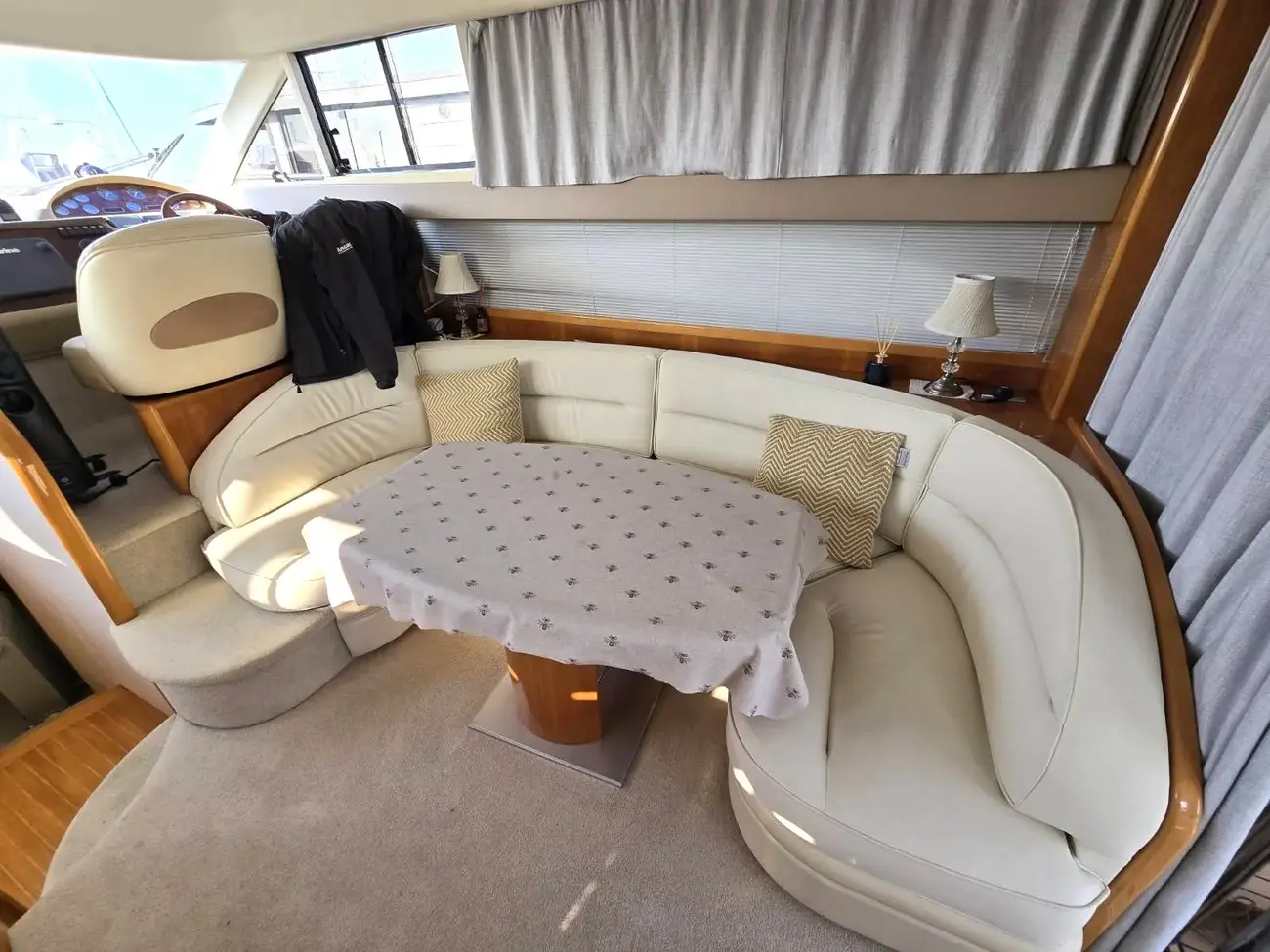 Her well-appointed flybridge provides excellent visibility and a generous social space for entertaining, while the bright saloon below features comfortable seating, refined wood finishes, and panoramic windows that flood the interior with natural light. The thoughtfully arranged galley and dining area create a welcoming onboard living environment.