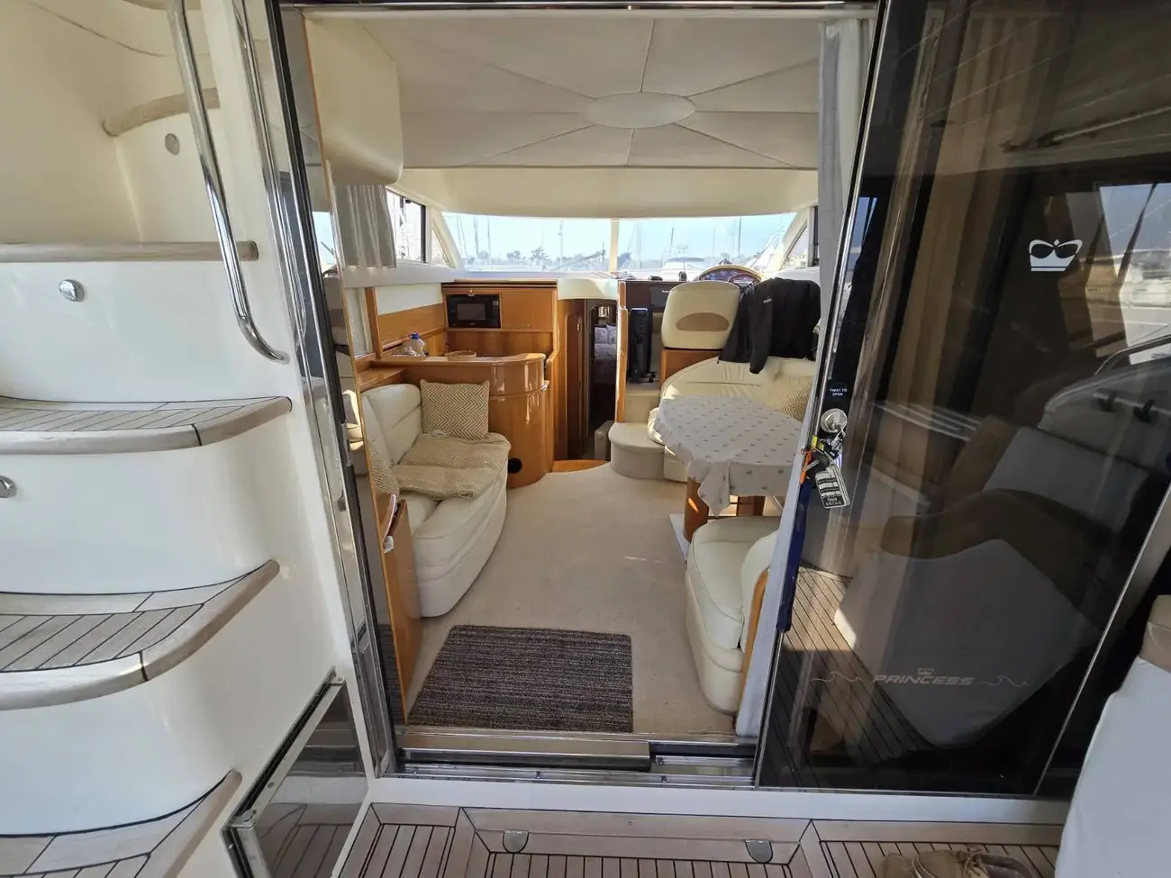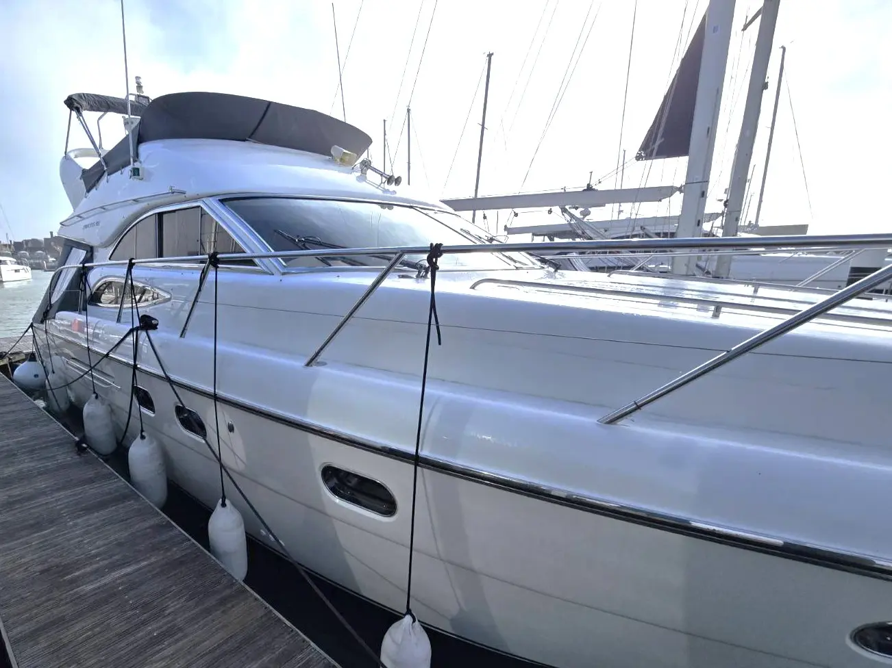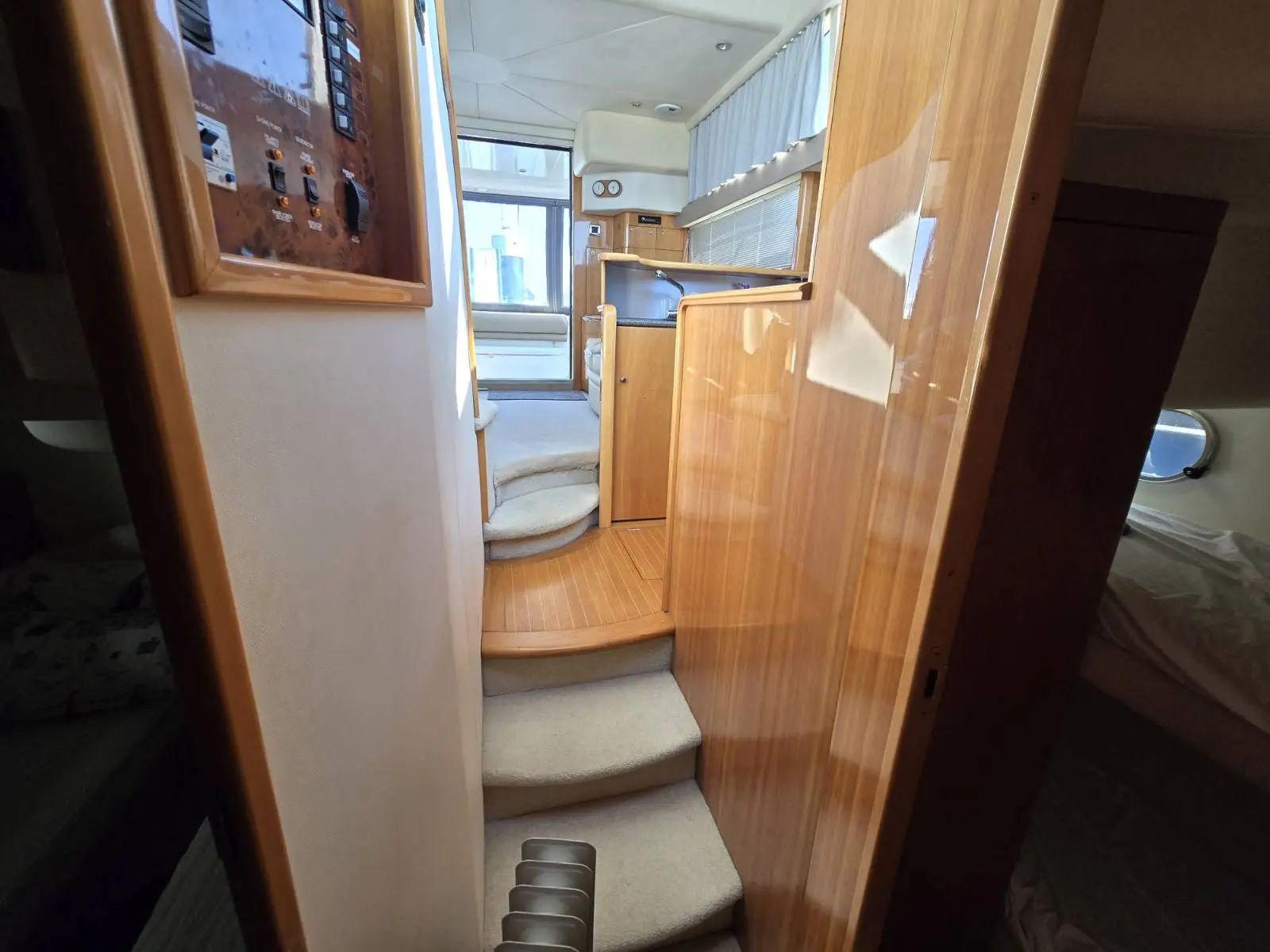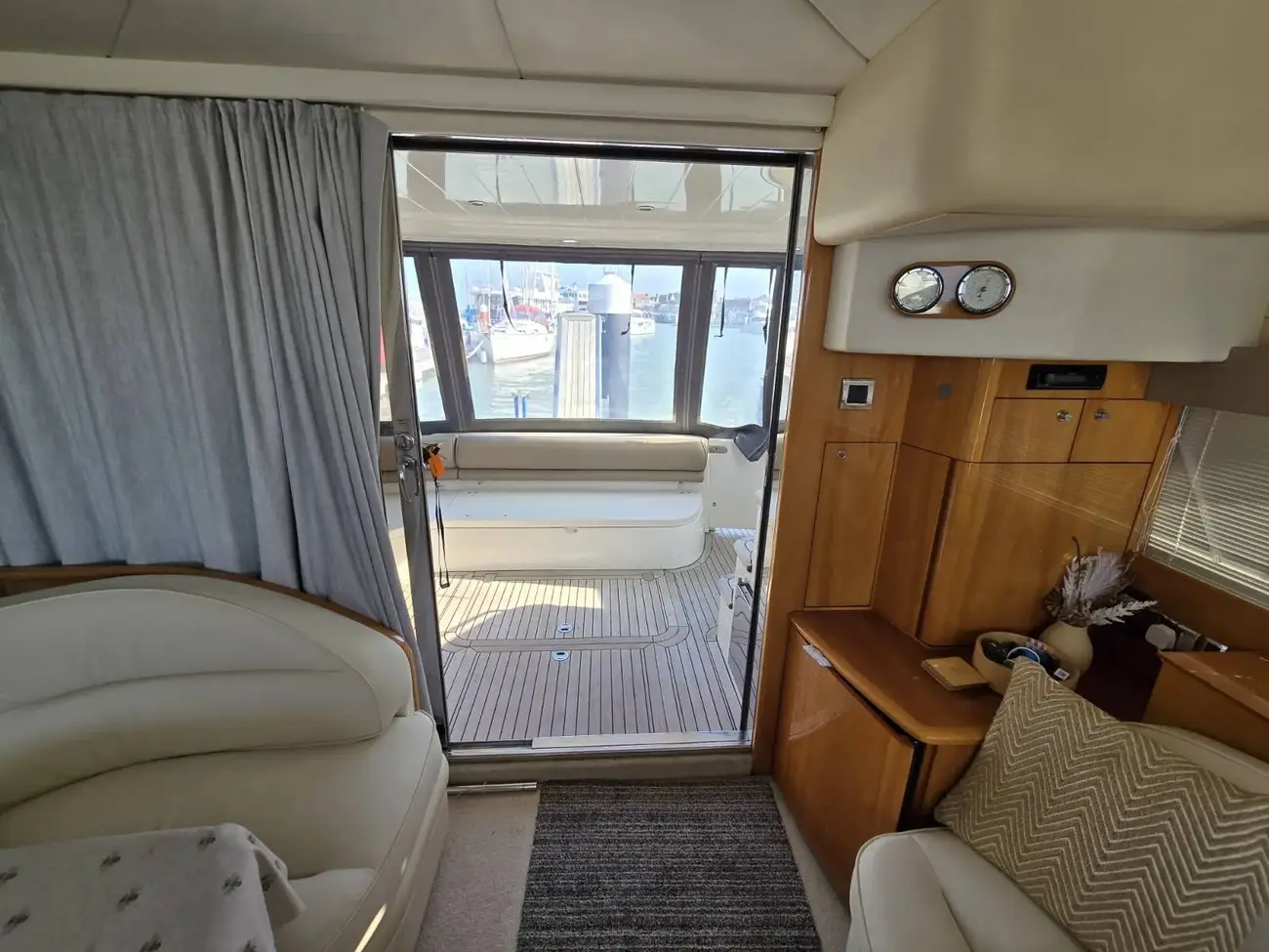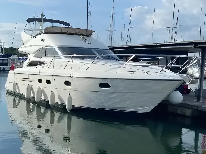 Her well-appointed flybridge provides excellent visibility and a generous social space for entertaining, while the bright saloon below features comfortable seating, refined wood finishes, and panoramic windows that flood the interior with natural light. The thoughtfully arranged galley and dining area create a welcoming onboard living environment.