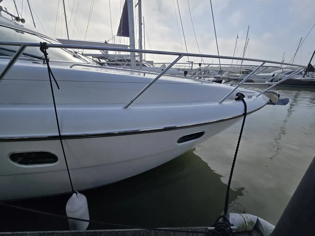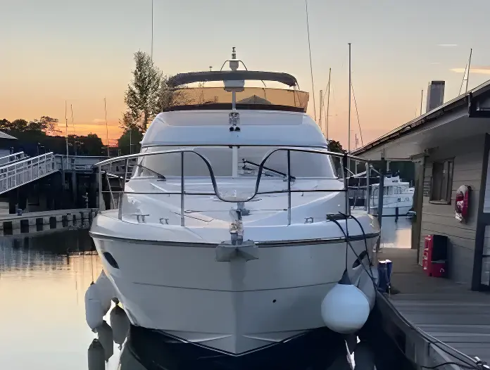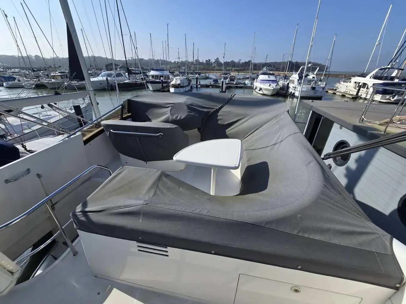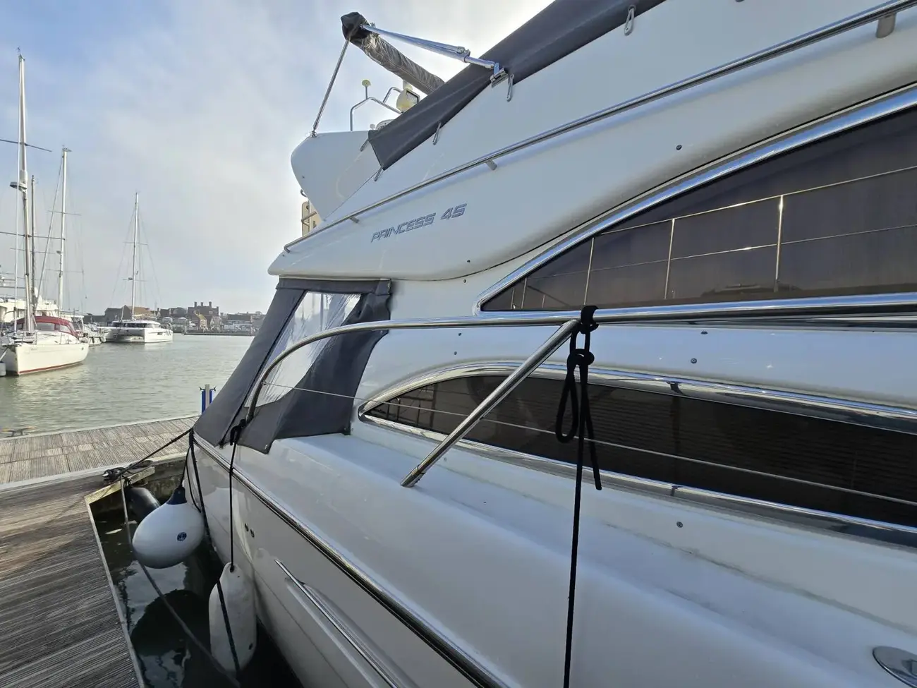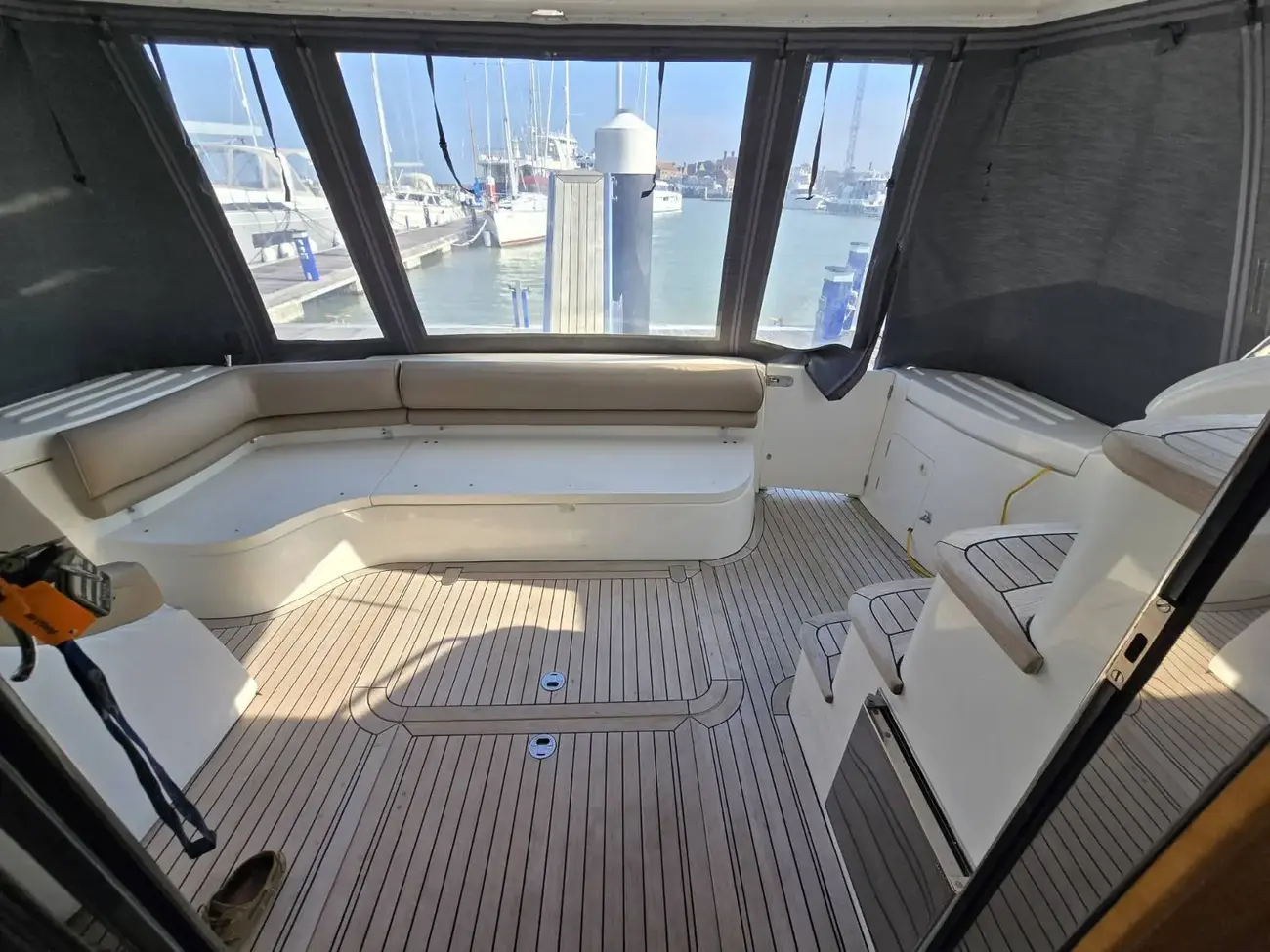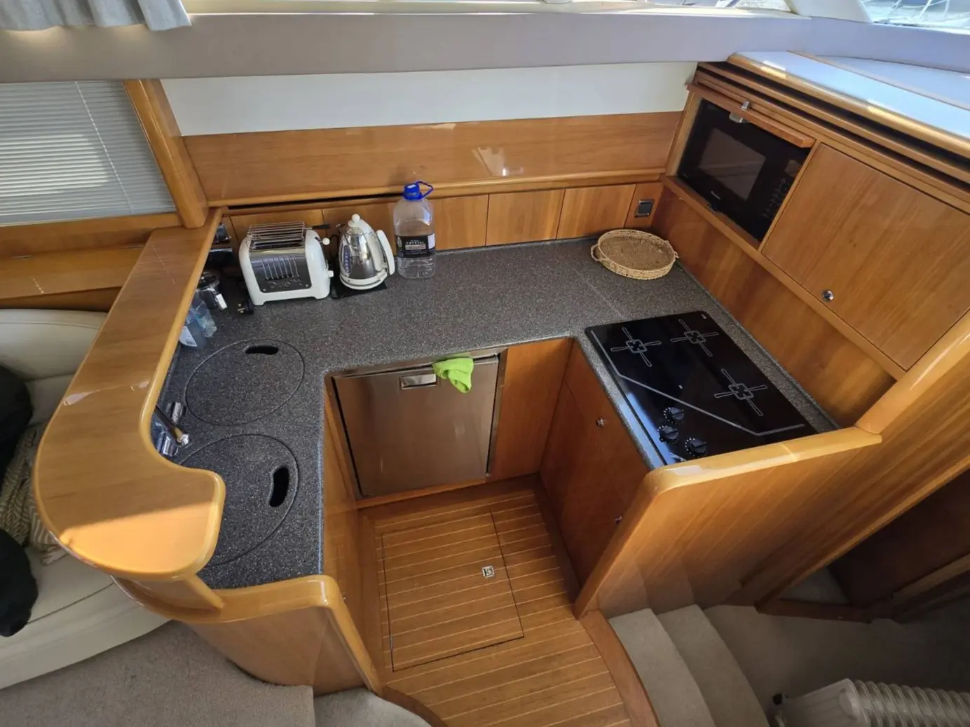 Her well-appointed flybridge provides excellent visibility and a generous social space for entertaining, while the bright saloon below features comfortable seating, refined wood finishes, and panoramic windows that flood the interior with natural light. The thoughtfully arranged galley and dining area create a welcoming onboard living environment.