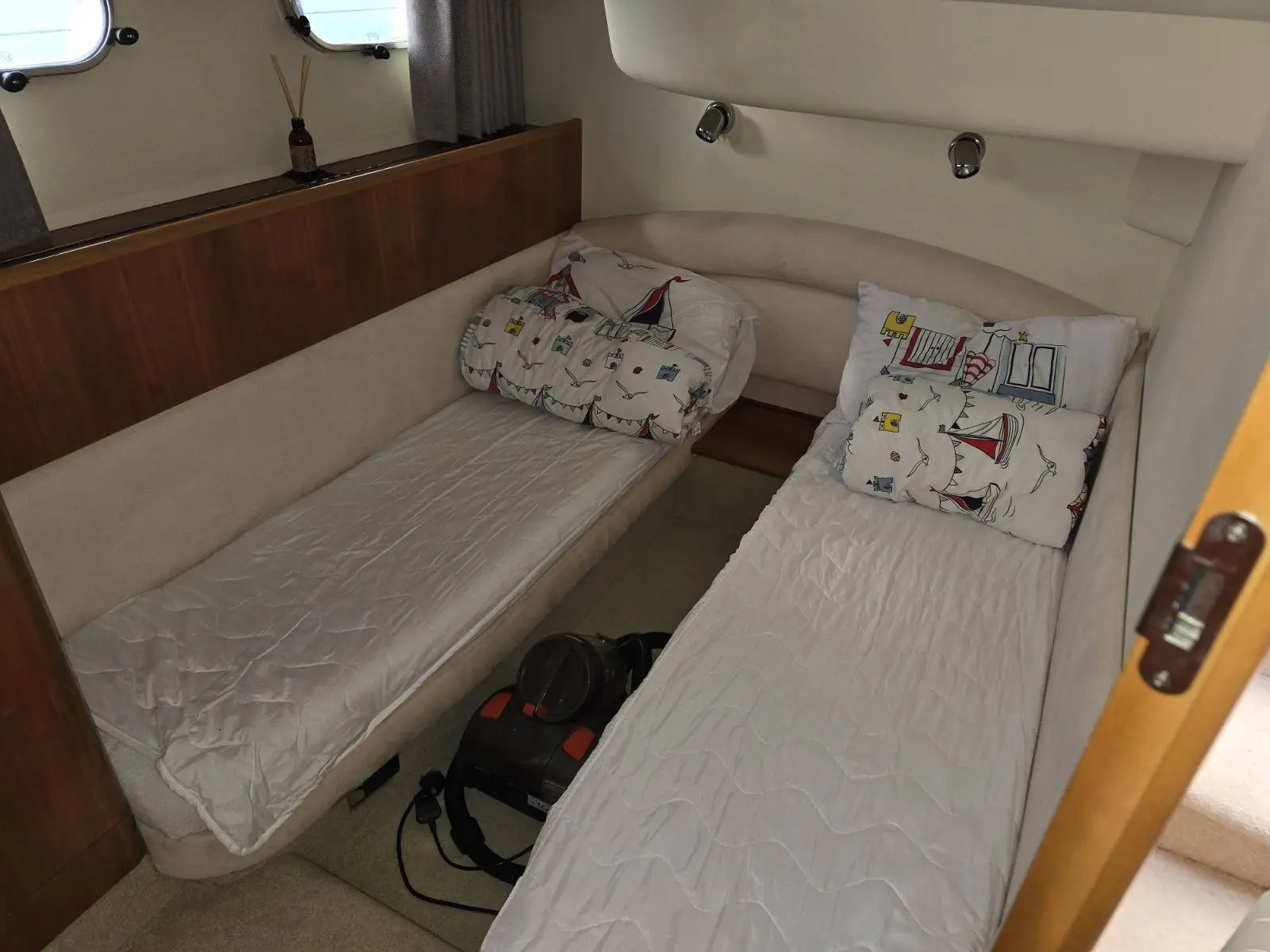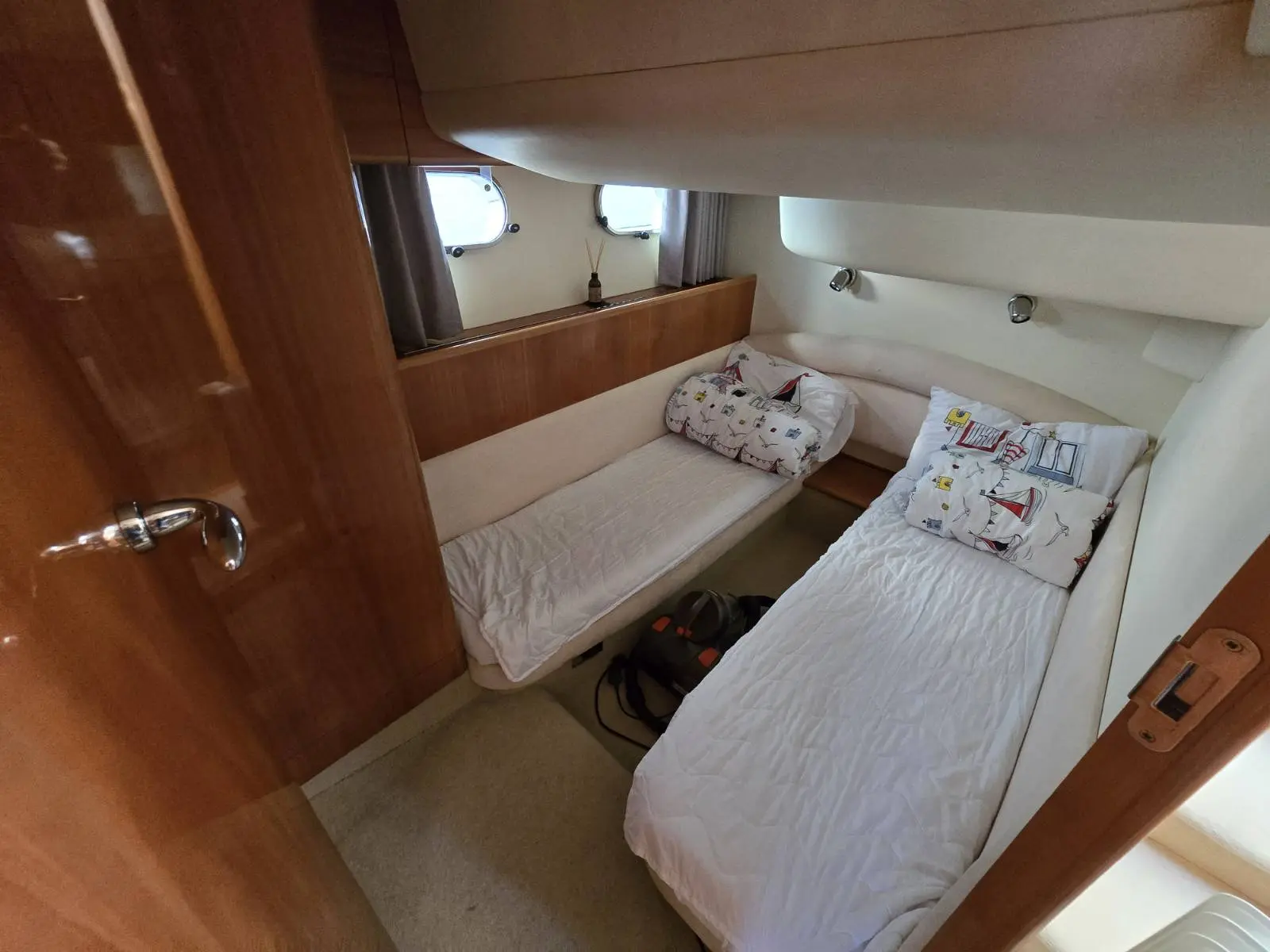 Guest cabin on the starboard side with two single beds in line.