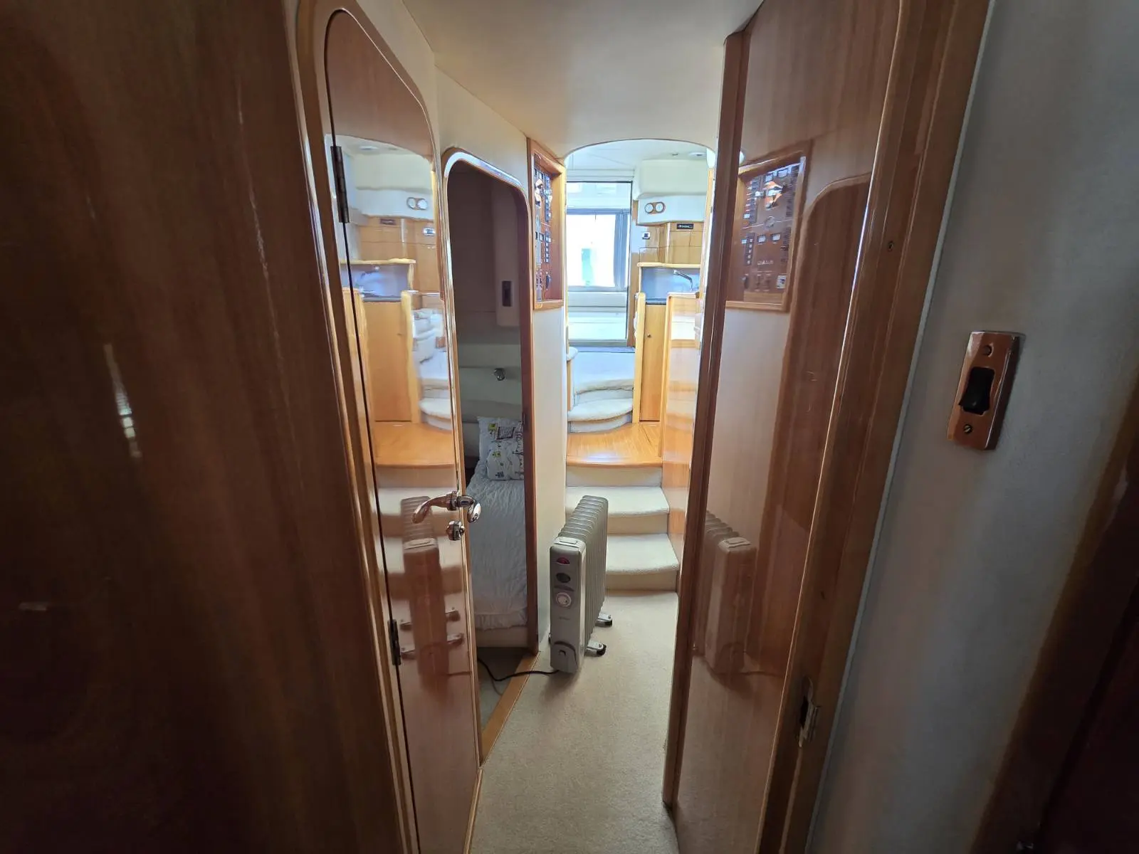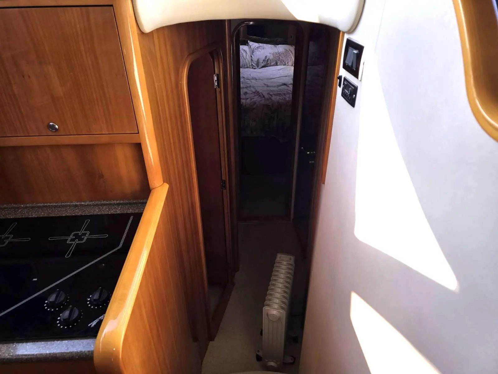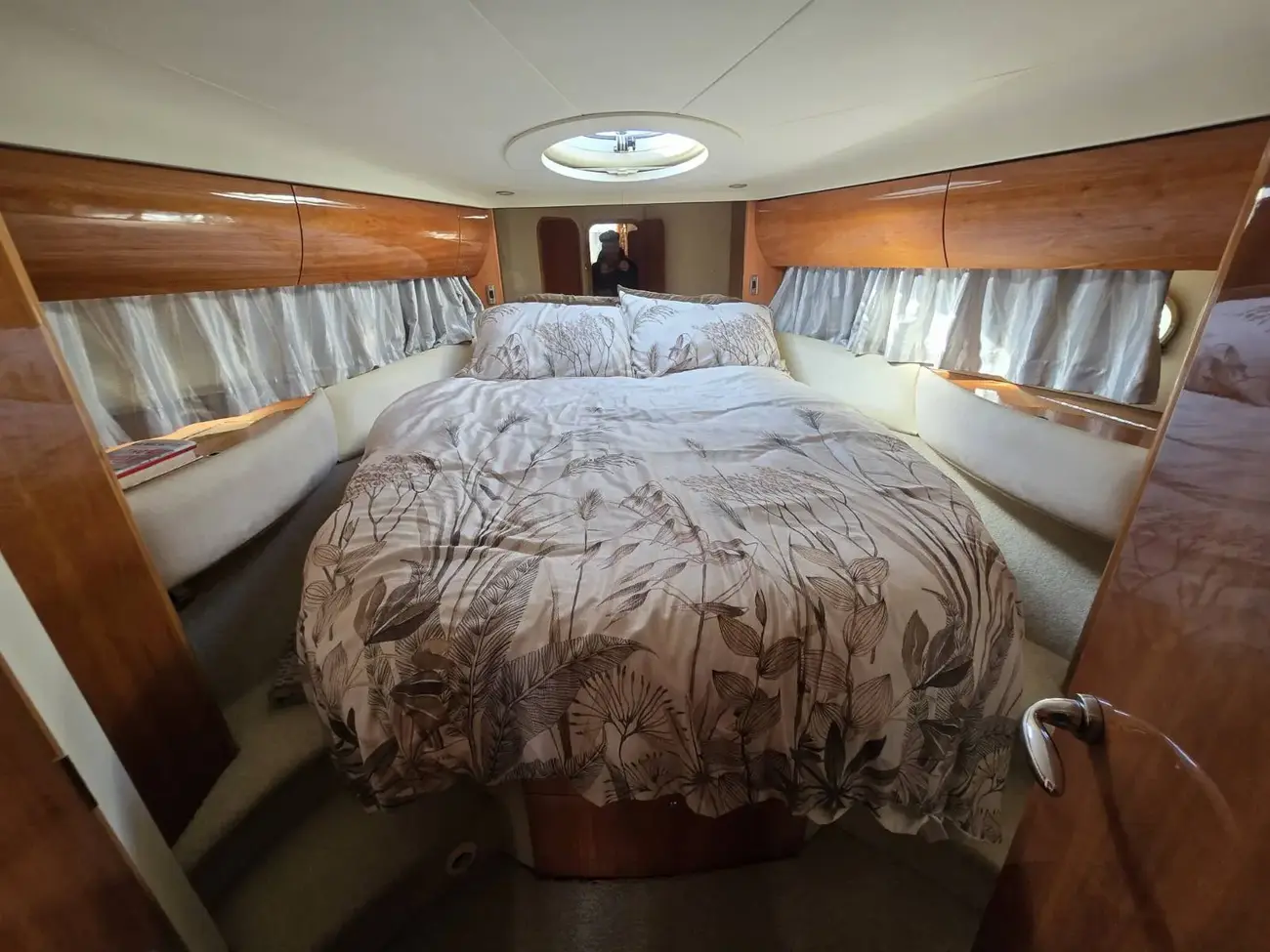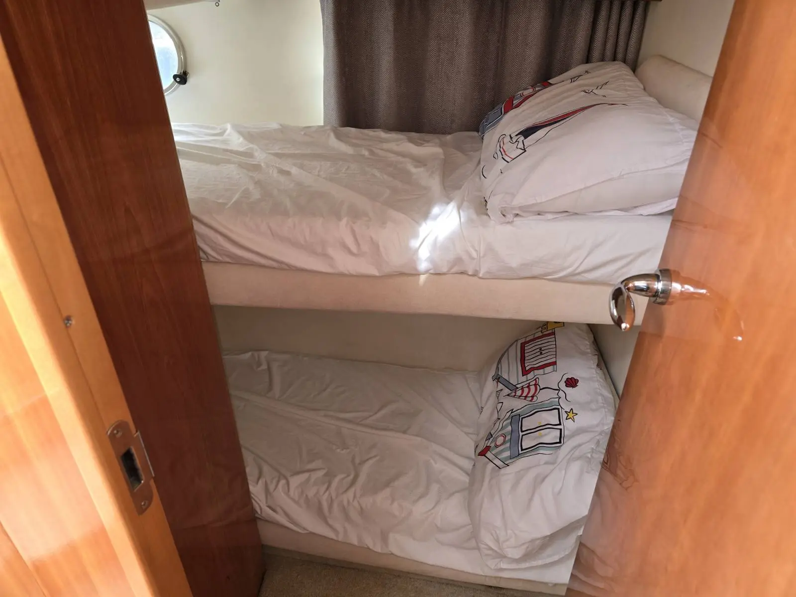 Guest cabin on the port side with bunk beds.