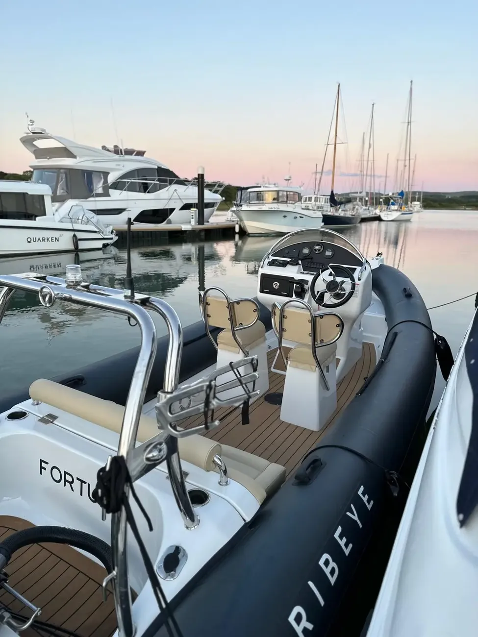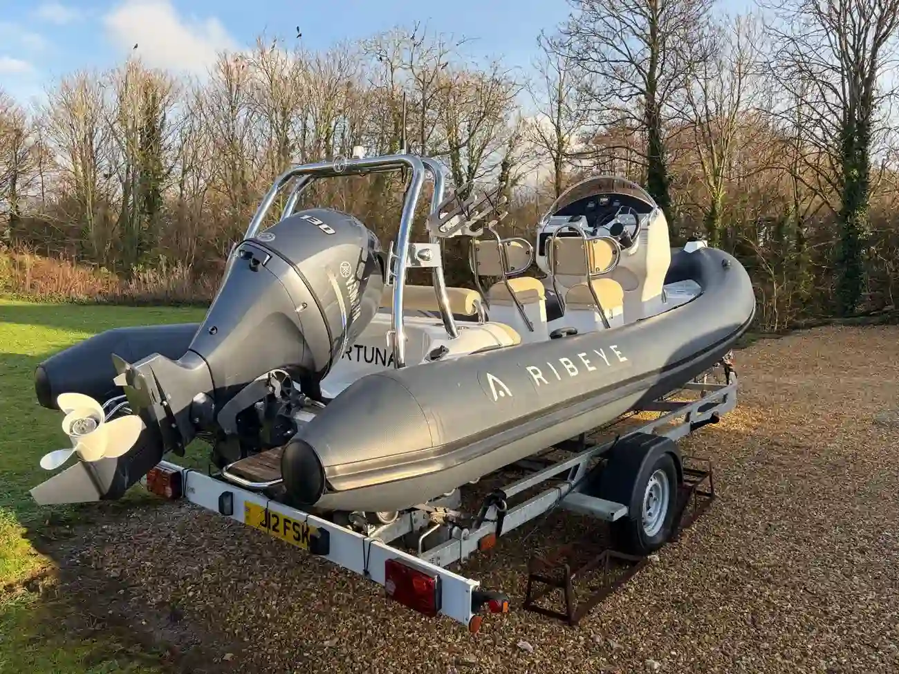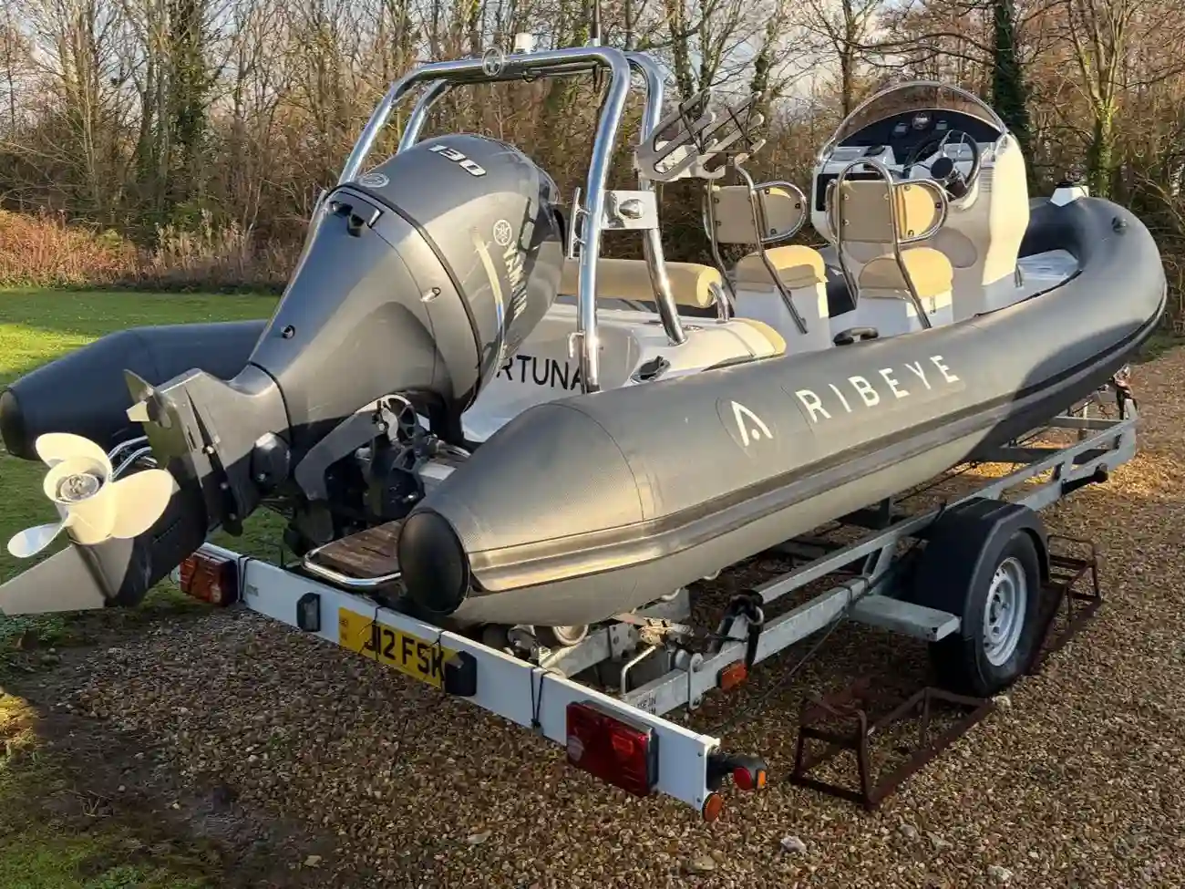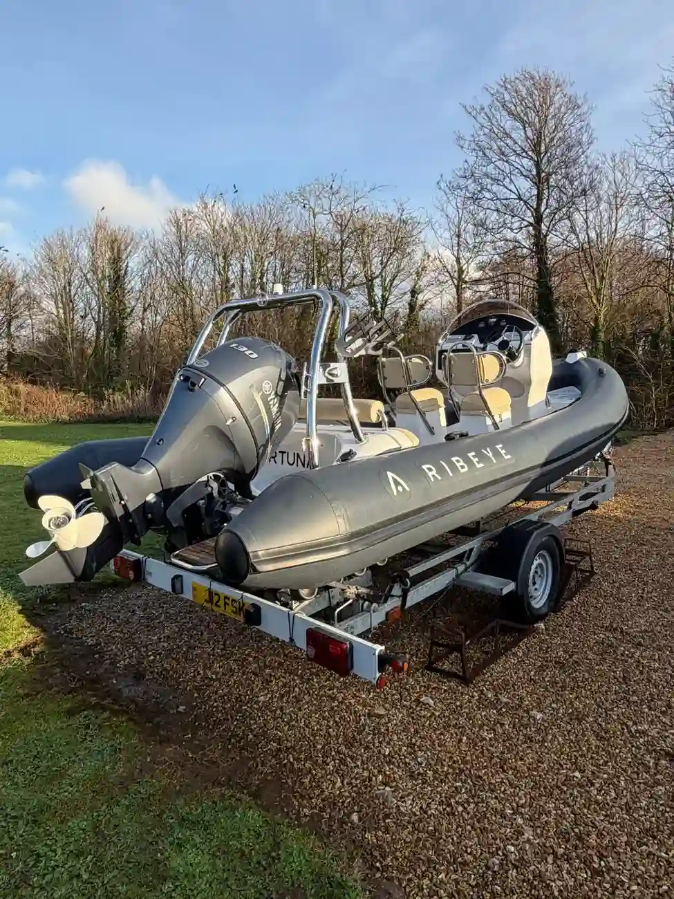 Fortuna is a 2023 Ribeye A600 with Yamaha 130hp with only 45 Hours on the clock! This nearly new Ribeye A600 is the ultimate all-rounder – perfect for thrilling days of water skiing or relaxed family outings. This is a stunning colour combination with the black tubes contrasting the cream seat covers. This boat combines performance with reliability. It comes fully equipped with a SBS roller trailer, Garmin chart plotter, Garmin VHF radio, and a Fusion audio system with high-quality speakers. The deck is illuminated with low-level blue LED lighting, enhancing its stylish, ready-to-go look. Designed for water sports, it includes an A-frame with tow eye, jockey seats, a boarding platform with ladder, Hypalon tubes, and Flexi-teak flooring. The Ribeye A600 stands out for its exceptional safety, strength, stability, speed, and comfort. There is a forward seat under which is the anchor and chain/rope and fenders. There are two ropes for mooring. This boat is ready to go straight to sea, everything you need is included. The trailer is in good condition and everything works and there is a prop bag too.