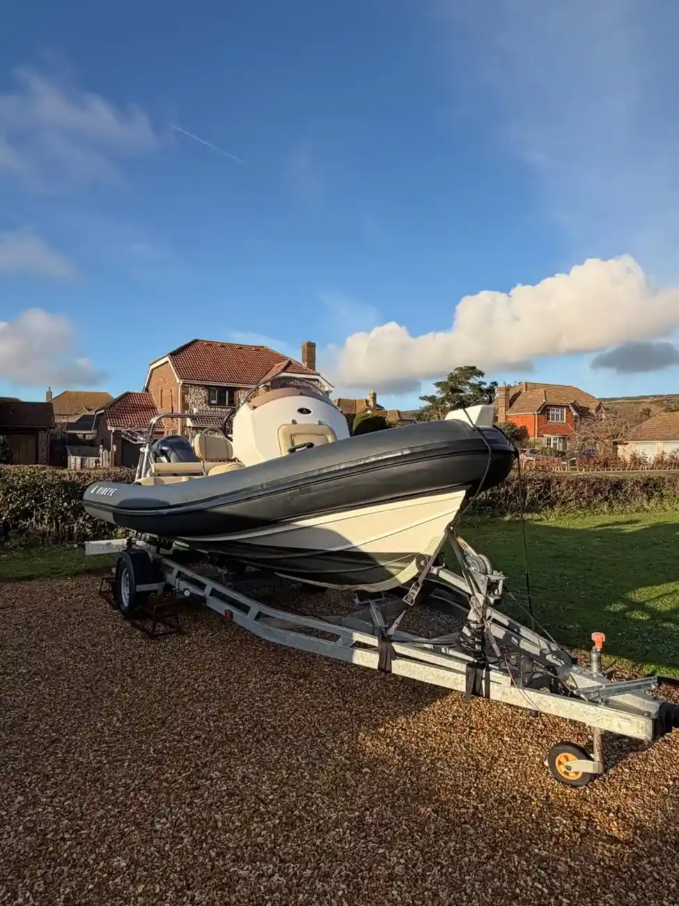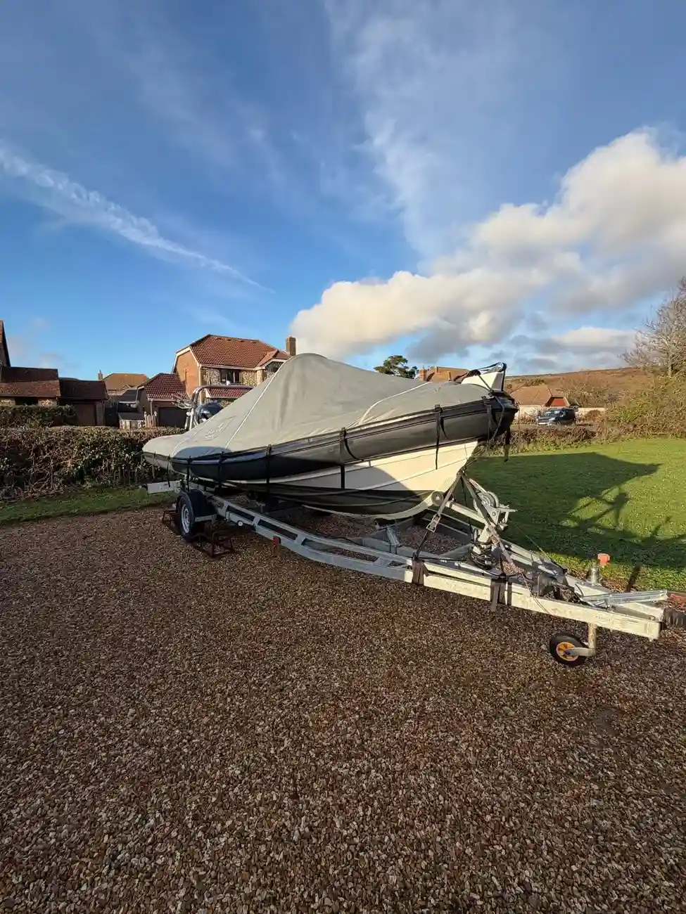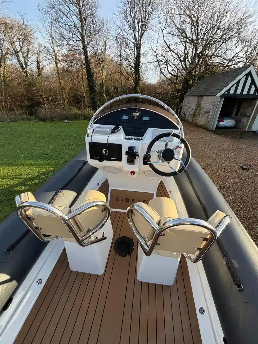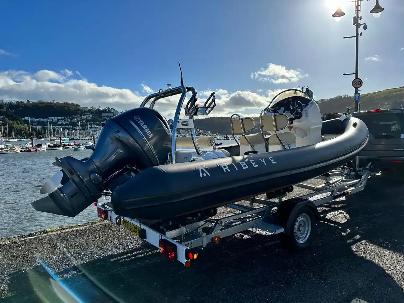 Fortuna is a 2023 Ribeye A600 with Yamaha 130hp with only 45 Hours on the clock! This nearly new Ribeye A600 is the ultimate all-rounder – perfect for thrilling days of water skiing or relaxed family outings. This is a stunning colour combination with the black tubes contrasting the cream seat covers. This boat combines performance with reliability. It comes fully equipped with a SBS roller trailer, Garmin chart plotter, Garmin VHF radio, and a Fusion audio system with high-quality speakers. The deck is illuminated with low-level blue LED lighting, enhancing its stylish, ready-to-go look. Designed for water sports, it includes an A-frame with tow eye, jockey seats, a boarding platform with ladder, Hypalon tubes, and Flexi-teak flooring. The Ribeye A600 stands out for its exceptional safety, strength, stability, speed, and comfort. There is a forward seat under which is the anchor and chain/rope and fenders. There are two ropes for mooring. This boat is ready to go straight to sea, everything you need is included. The trailer is in good condition and everything works and there is a prop bag too.
