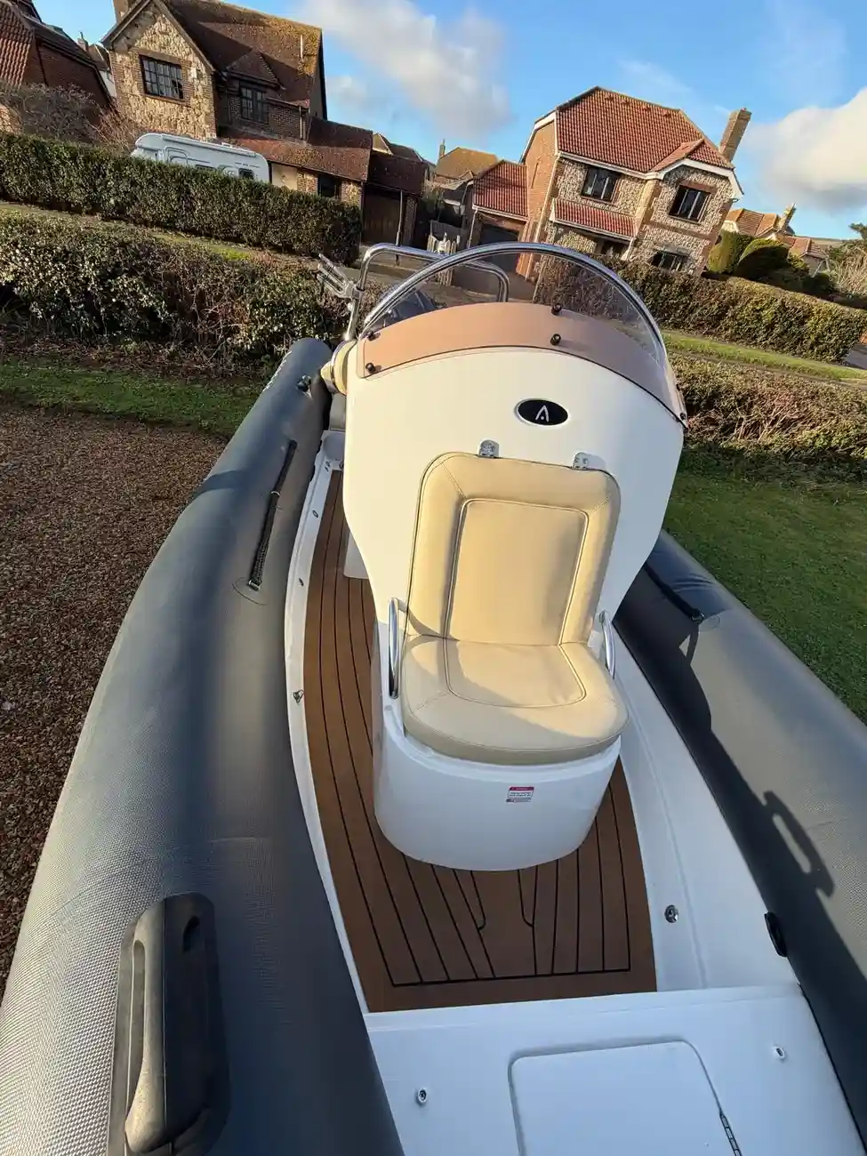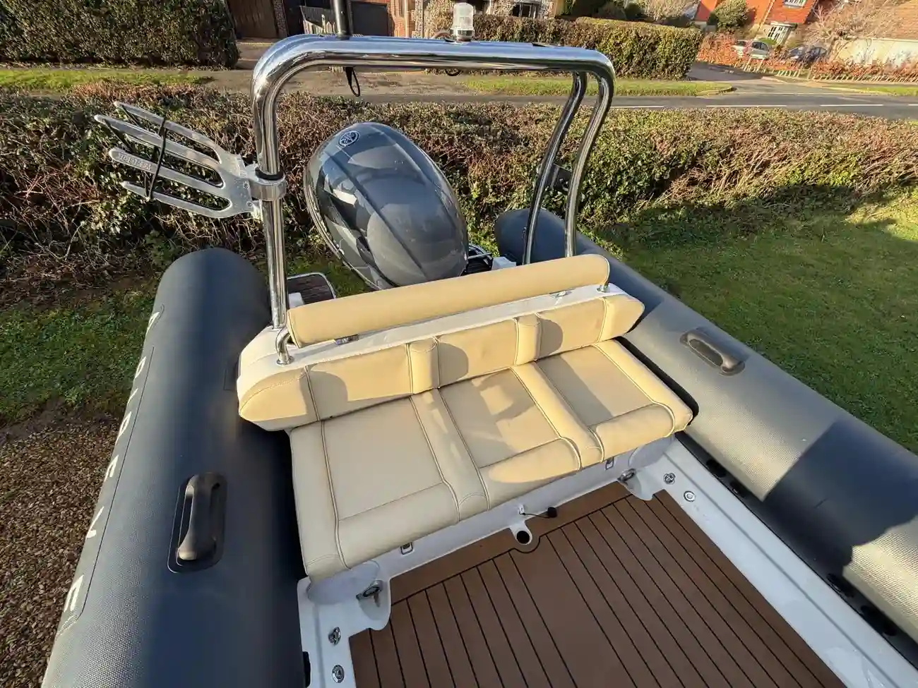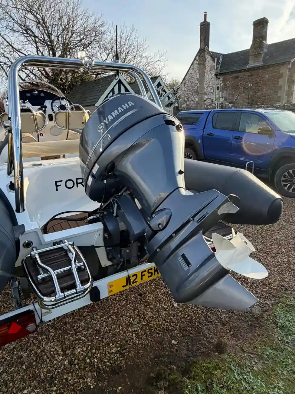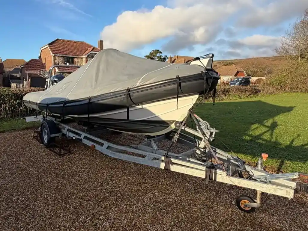 Fortuna is a 2023 Ribeye A600 with Yamaha 130hp with only 45 Hours on the clock! This nearly new Ribeye A600 is the ultimate all-rounder – perfect for thrilling days of water skiing or relaxed family outings. This is a stunning colour combination with the black tubes contrasting the cream seat covers. This boat combines performance with reliability. It comes fully equipped with a SBS roller trailer, Garmin chart plotter, Garmin VHF radio, and a Fusion audio system with high-quality speakers. The deck is illuminated with low-level blue LED lighting, enhancing its stylish, ready-to-go look. Designed for water sports, it includes an A-frame with tow eye, jockey seats, a boarding platform with ladder, Hypalon tubes, and Flexi-teak flooring. The Ribeye A600 stands out for its exceptional safety, strength, stability, speed, and comfort. There is a forward seat under which is the anchor and chain/rope and fenders. There are two ropes for mooring. This boat is ready to go straight to sea, everything you need is included. The trailer is in good condition and everything works and there is a prop bag too.